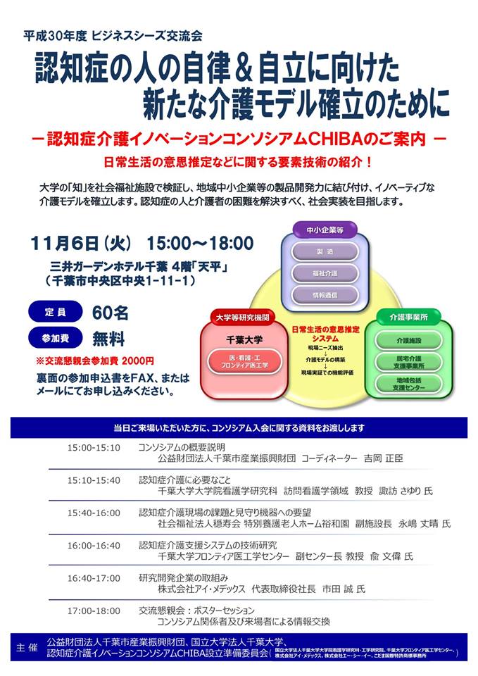来春予定しております千葉発の介護イノベーションコンソシアムの設立について紹介する交流会を11月6日に開催します。