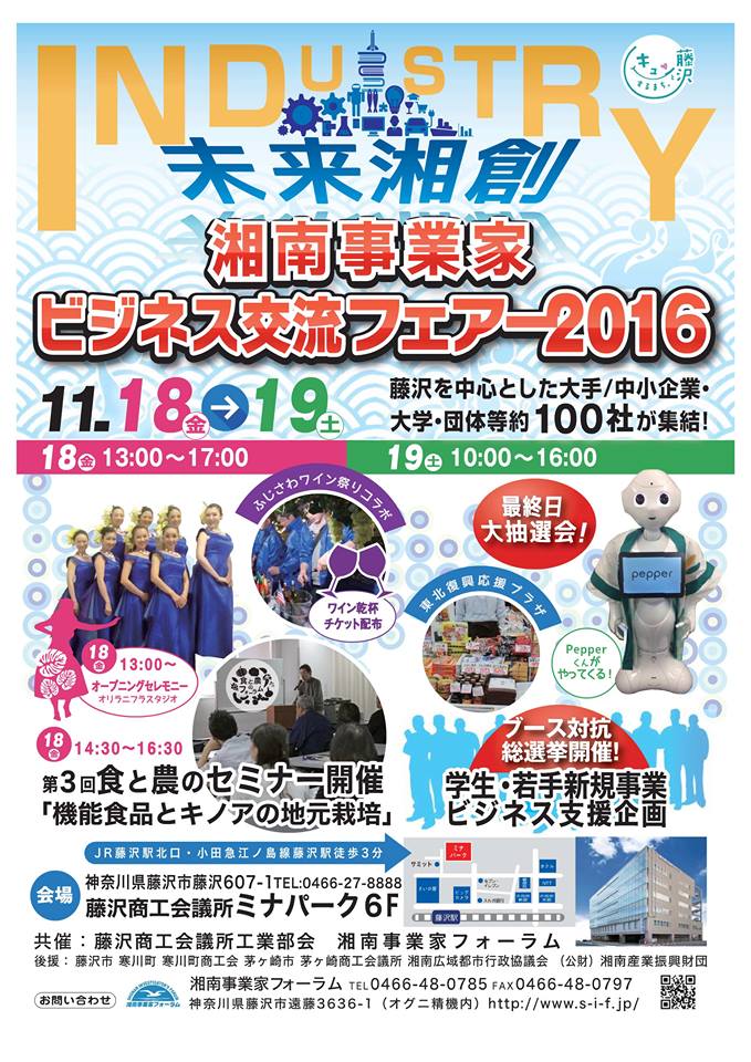 今年も神奈川県藤沢市で行われる「湘南事業家ビジネス交流フェア2016」に参加します。神奈川県藤沢市を中心に活躍されている企業が多数出展します。